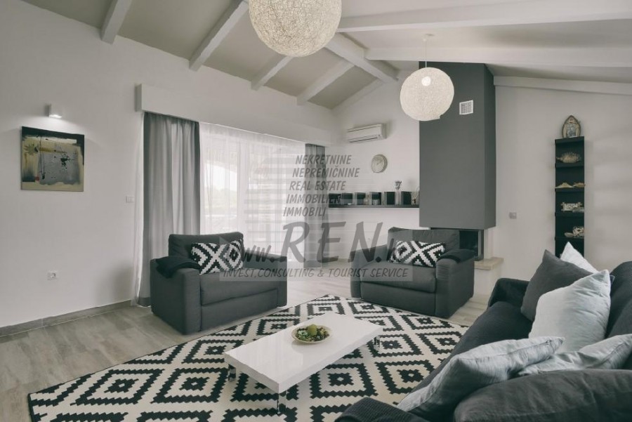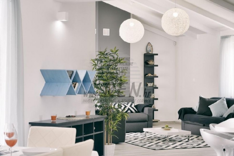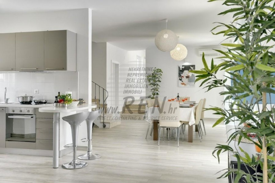 Kuća ima ukupno 2x 220m2, zemljišta ima 1340 m2, udaljena je 5 min. (300m) od mora i od prekrasne uređene prirodne plaže, 5 min. (1000m) udaljeni ste od centra. Kuća je samostojeća te ima prizemlje i prvi kat (2 cjeline). Ukupno ima 4 spavaće sobe, kuhinju, dnevnu sobu, 3 kupatila, spremište, WC. Kuća ima vlastiti parking, 2 terase, kamin, 2 bazena 40m2, grijanje i hlađenje, uređen okoliš, pogled na more.