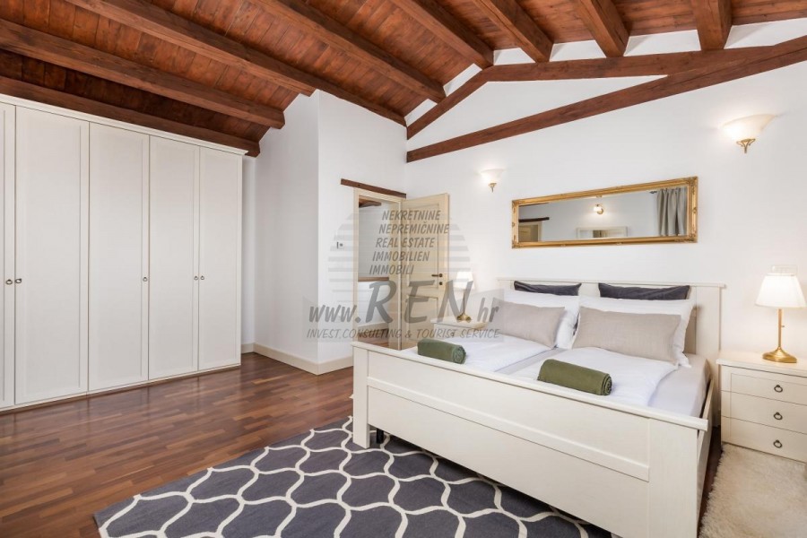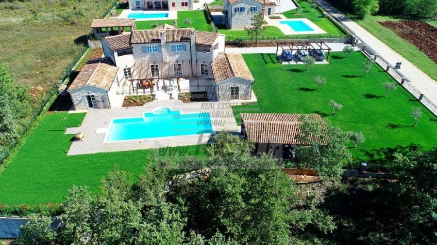 Kuća ima ukupno 269,70 m2, zemljišta ima 2250 m2, udaljena je 10 min. (15km) od mora i od prekrasne uređene prirodne plaže, 10 min. (15km) udaljeni ste od centra Poreča. Kuća ima prizemlje i prvi kat. Ukupno ima 4 spavaće sobe, kuhinju, dnevnu sobu, 4 kupatila, WC, spremište, garderobu. Kuća ima vlastiti parking, terasu, bazen, ljetnu kuhinju, alarmni sustav, kamin, centralno i podno grijanje.