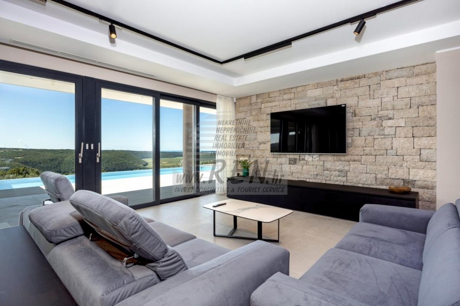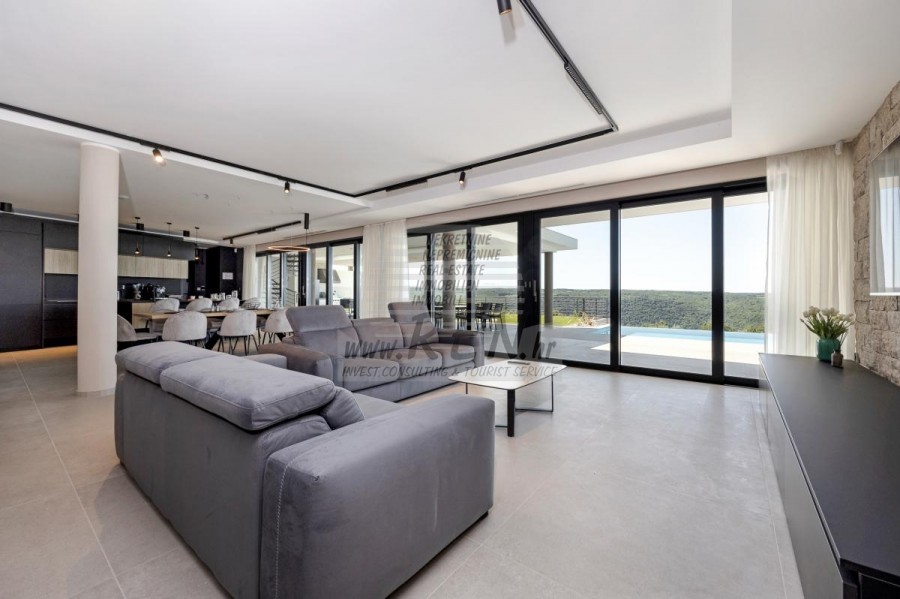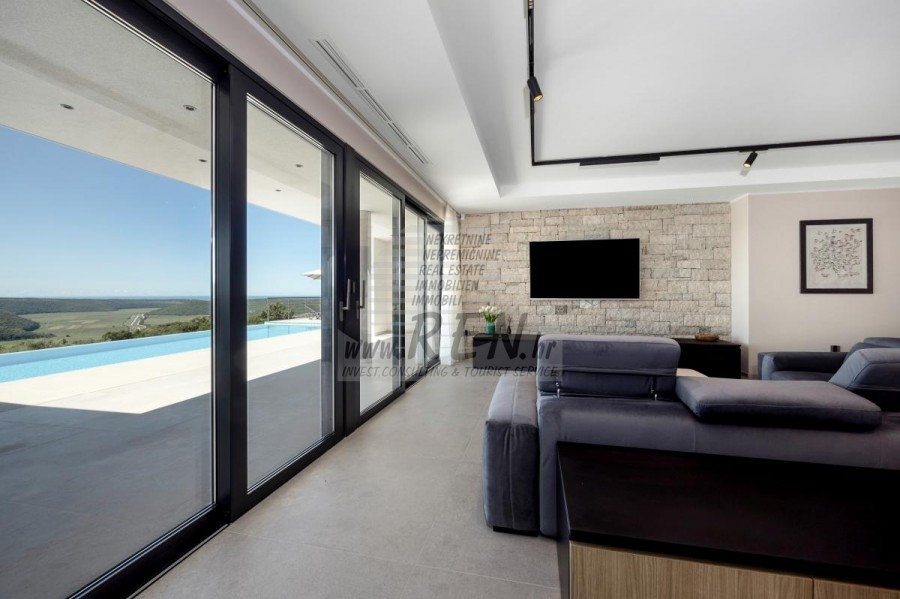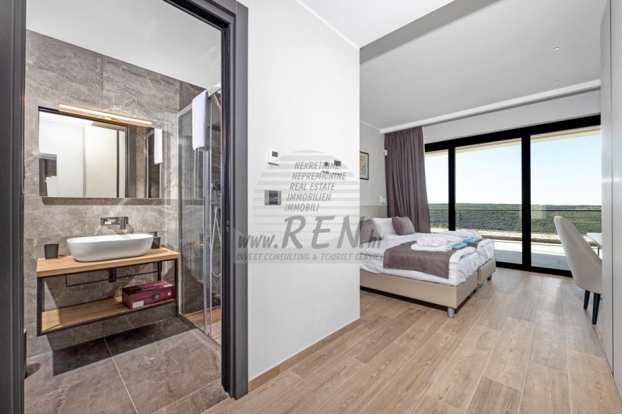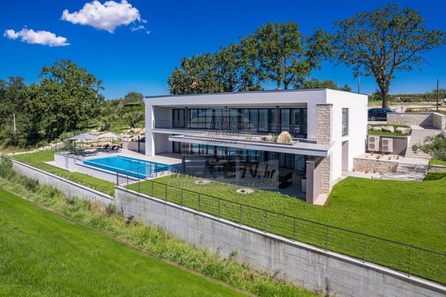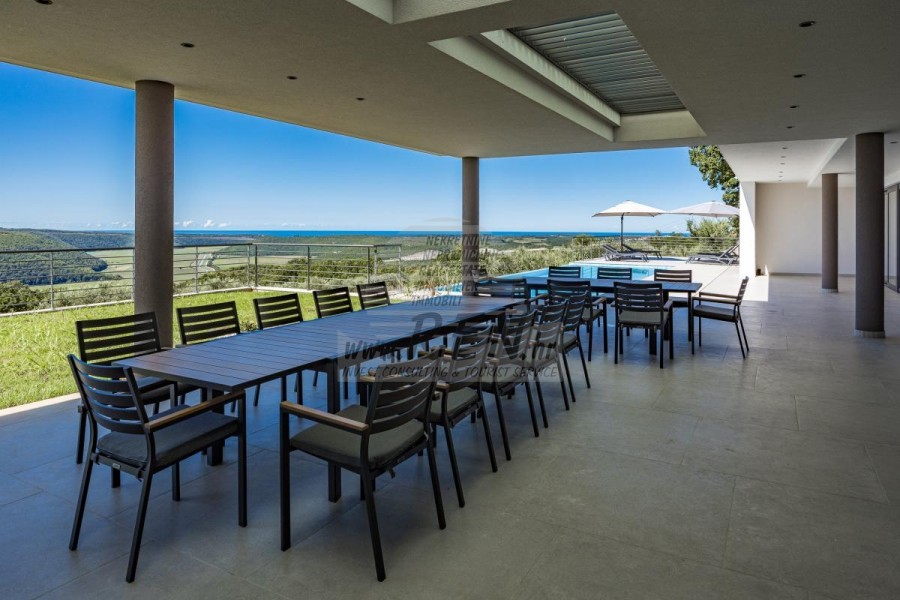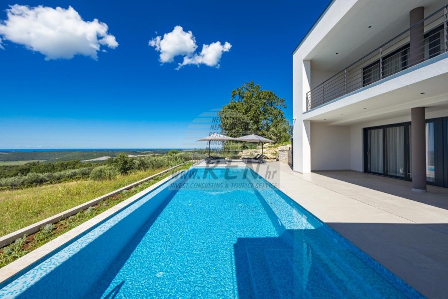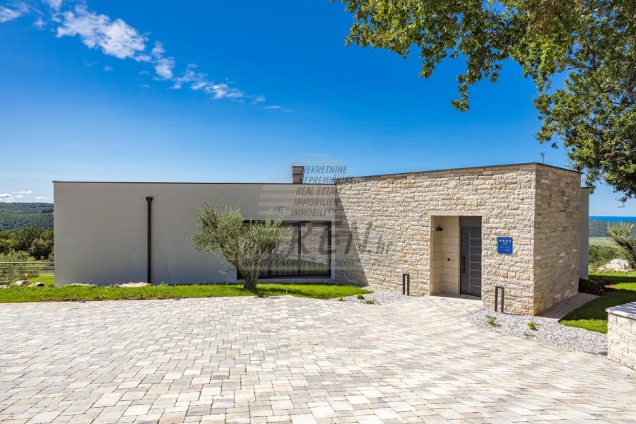 Luksuzna villa s jednim od najljepših pogleda u Istri nalazi se u mirnom i malom mjestu u okolici Buja, iz kojeg se pruža čaroban pogled od planine Učke, rijeke Mirne i mora te čak do Alpa. Plivajući u bazenu dužine 14 m možete uživati u pogledu na dolinu rijeke Mirne, lovište i Motovunsku šumu poznatu po čuvenom Istarskom tartufu. Kompletno imanje od 1700 m2 ograđeno i udaljeno od ostalih kuća. Te je okruženo maslinikom. Imanje je novo sagrađeno u skladu sa ekološkim standardima, isključivo sa prirodnim materijalima kao što je kamen/drvo, okućnica je uređena isključivo sa domaćim biljkama, masline. Vila ima 6 spavaće sobe sa pripadajućim kupaonicama, a iz svih se pruža prekrasan pogled na more. Dnevni dio prostire se na 100m2, te obuhvaća luksuznu kuhinju sa otokom opremljenu najmodernijom suvremenom tehnologijom… tu je i blagovaonica sa kaminom, kao i dnevni boravak sa prekrasnim pogledom na more, te ima dvoja francuska vrata koje vode na vanjsku terasu, sunčalište, bazen, ljetnu kuhinju i travnjak. U nastavku dnevnog boravka nalazi se Wellness te fitnes iz kojih se također pruža prekrasan pogled. Sav namještaj potpisuju dizajneri i rađen je po mjeri. Objek je opremljen sa najsuvremenijim sistemom centralnog grijanja i hlađenja, kao i solarnim panelima, a sve kupaonice imaju i podna grijanja. Bazen osim sunčališta, očaravajućih pogleda, mira nudi i posebno veliki vanjski tuš. Na imanju se nalazi i parking za pet automobila, kao i svi dodatni sadržaji kao što su; vanjski roštilj.
