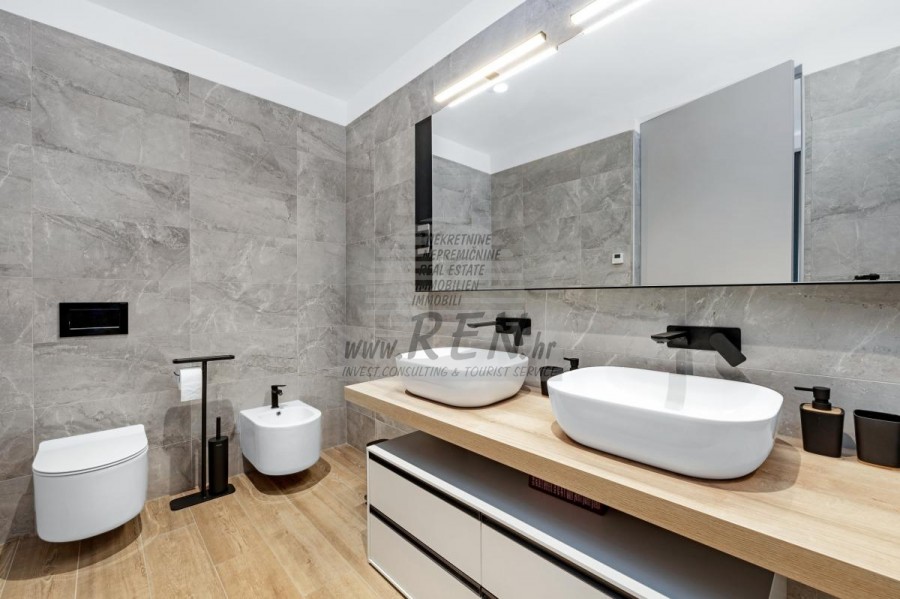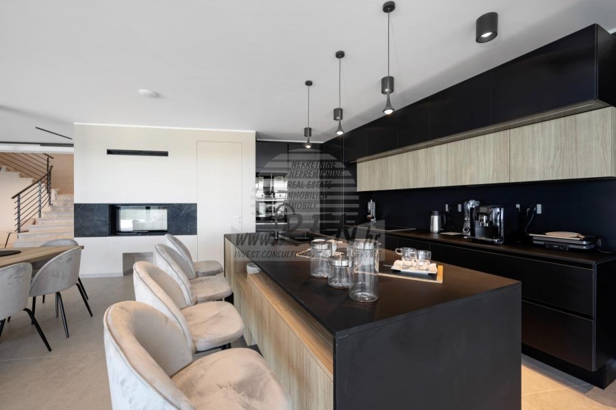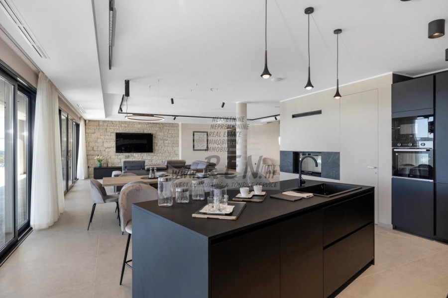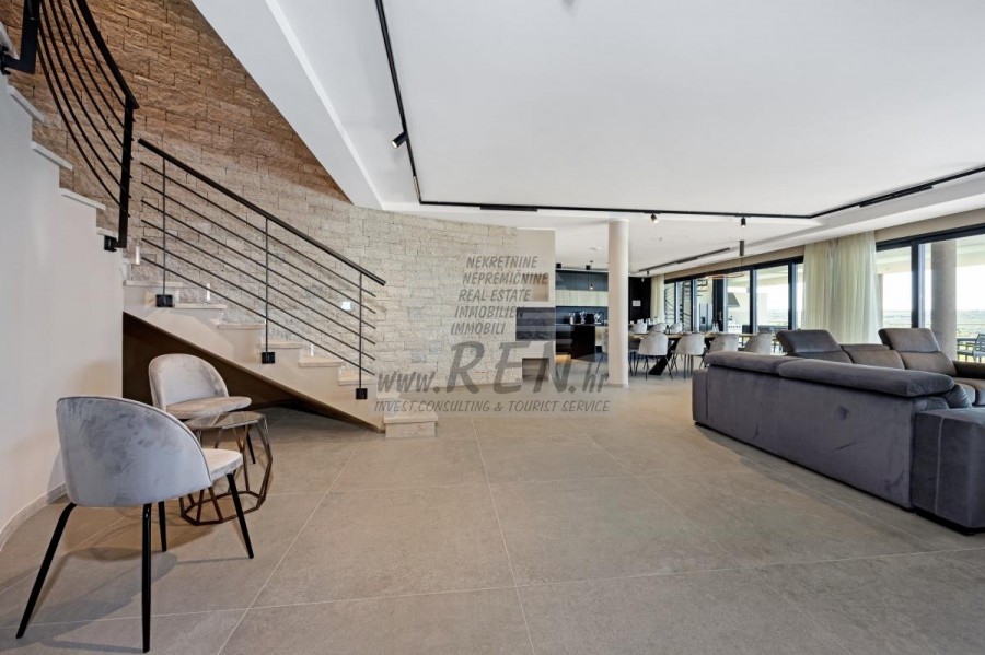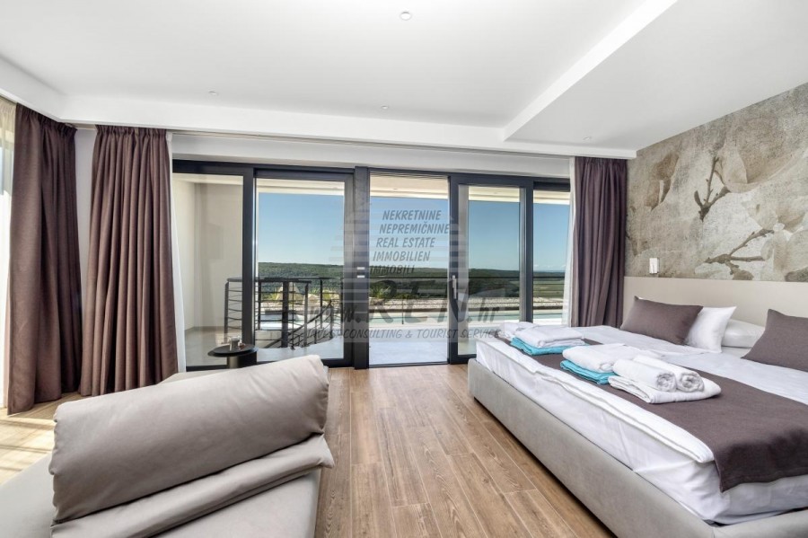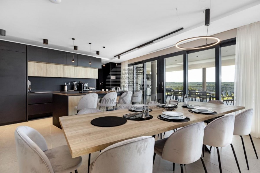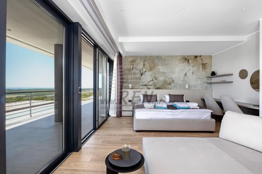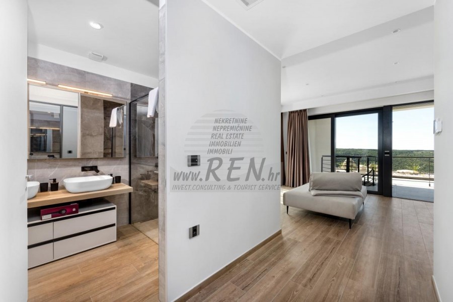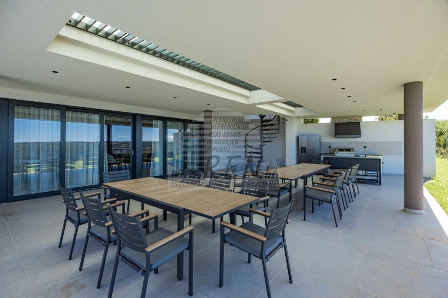 Luksuzna villa s jednim od najljepših pogleda u Istri nalazi se u mirnom i malom mjestu u okolici Buja, iz kojeg se pruža čaroban pogled od planine Učke, rijeke Mirne i mora te čak do Alpa. Plivajući u bazenu dužine 14 m možete uživati u pogledu na dolinu rijeke Mirne, lovište i Motovunsku šumu poznatu po čuvenom Istarskom tartufu. Kompletno imanje od 1700 m2 ograđeno i udaljeno od ostalih kuća. Te je okruženo maslinikom. Imanje je novo sagrađeno u skladu sa ekološkim standardima, isključivo sa prirodnim materijalima kao što je kamen/drvo, okućnica je uređena isključivo sa domaćim biljkama, masline. Vila ima 6 spavaće sobe sa pripadajućim kupaonicama, a iz svih se pruža prekrasan pogled na more. Dnevni dio prostire se na 100m2, te obuhvaća luksuznu kuhinju sa otokom opremljenu najmodernijom suvremenom tehnologijom… tu je i blagovaonica sa kaminom, kao i dnevni boravak sa prekrasnim pogledom na more, te ima dvoja francuska vrata koje vode na vanjsku terasu, sunčalište, bazen, ljetnu kuhinju i travnjak. U nastavku dnevnog boravka nalazi se Wellness te fitnes iz kojih se također pruža prekrasan pogled. Sav namještaj potpisuju dizajneri i rađen je po mjeri. Objek je opremljen sa najsuvremenijim sistemom centralnog grijanja i hlađenja, kao i solarnim panelima, a sve kupaonice imaju i podna grijanja. Bazen osim sunčališta, očaravajućih pogleda, mira nudi i posebno veliki vanjski tuš. Na imanju se nalazi i parking za pet automobila, kao i svi dodatni sadržaji kao što su; vanjski roštilj.