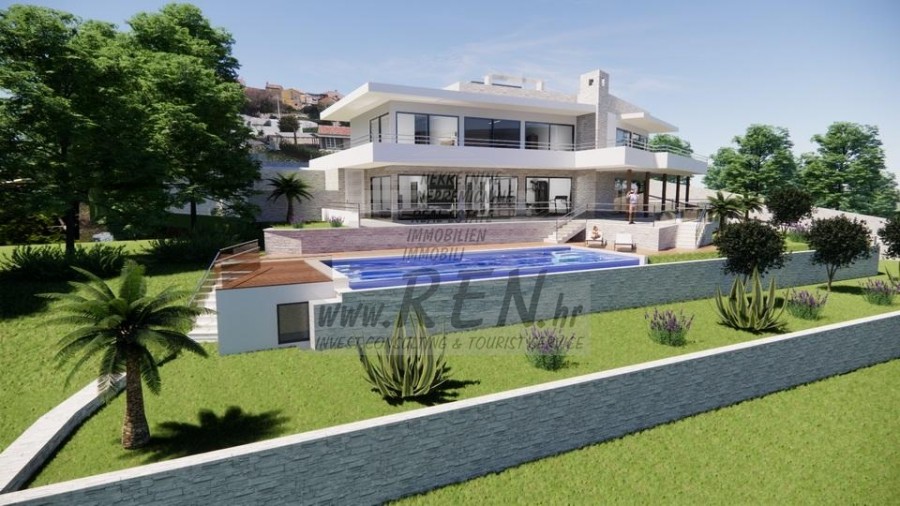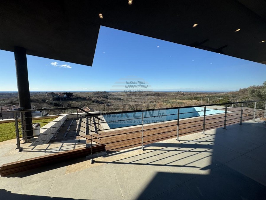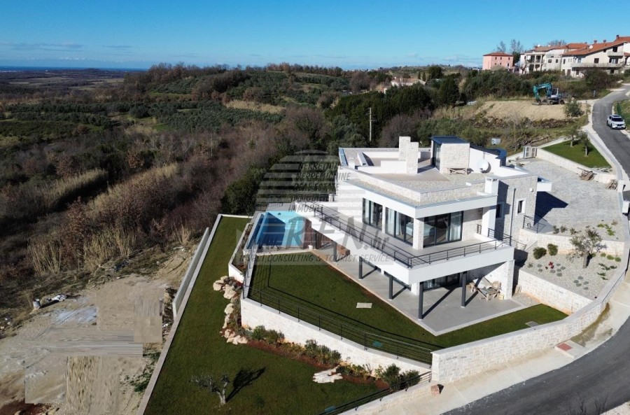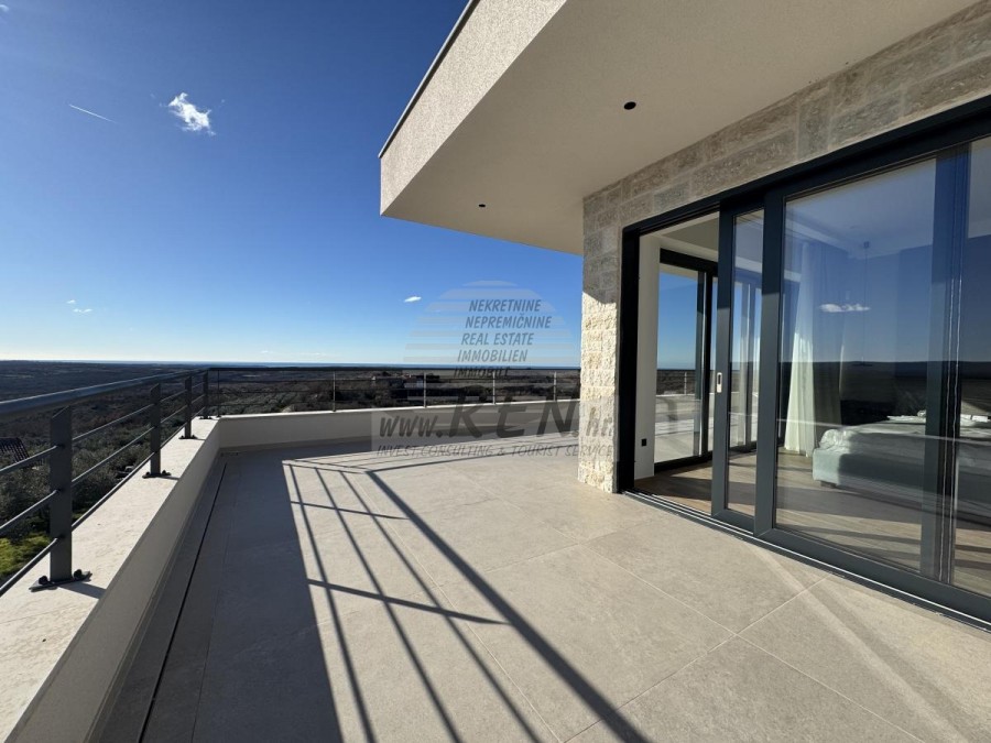 Luksuzna villa s jednim od najljepših pogleda u Istri nalazi se u mirnom i malom mjestu u okolici Buja, iz kojeg se pruža čaroban pogled od planine Učke, rijeke Mirne i mora te čak do Alpa. Plivajući u bazenu dužine 14 m možete uživati u pogledu na dolinu rijeke Mirne, lovište i Motovunsku šumu poznatu po čuvenom Istarskom tartufu. Imanje je novo sagrađeno u skladu sa ekološkim standardima, isključivo sa prirodnim materijalima kao što je kamen/drvo, okućnica je uređena isključivo sa domaćim biljkama, masline. Vila ima 6 spavaće sobe sa pripadajućim kupaonicama, a iz svih se pruža prekrasan pogled na more. Dnevni dio prostire se na 100m2, te obuhvaća luksuznu kuhinju sa otokom opremljenu najmodernijom suvremenom tehnologijom… tu je i blagovaonica sa kaminom, kao i dnevni boravak sa prekrasnim pogledom na more, te ima dvoja francuska vrata koje vode na vanjsku terasu, sunčalište, bazen, ljetnu kuhinju i travnjak. U nastavku dnevnog boravka nalazi se Wellness te fitnes iz kojih se također pruža prekrasan pogled. Sav namještaj potpisuju dizajneri i rađen je po mjeri. Objek je opremljen sa najsuvremenijim sistemom centralnog grijanja i hlađenja, kao i solarnim panelima, a sve kupaonice imaju i podna grijanja. Bazen osim sunčališta, očaravajućih pogleda, mira nudi i posebno veliki vanjski tuš. Na imanju se nalazi i parking za pet automobila, kao i svi dodatni sadržaji kao što su; vanjski roštilj.
