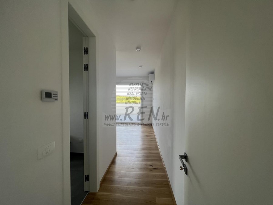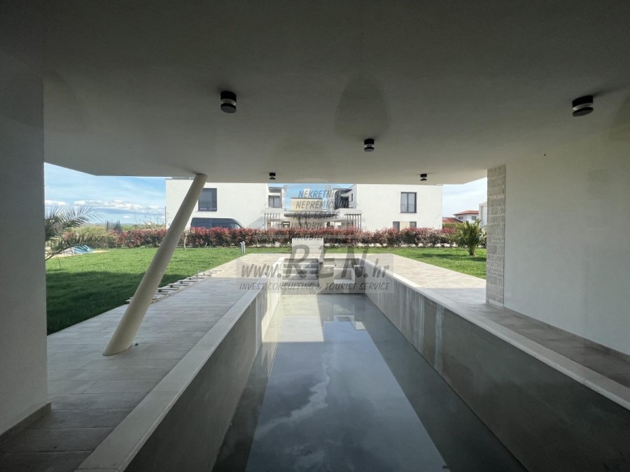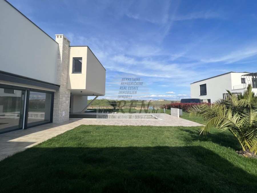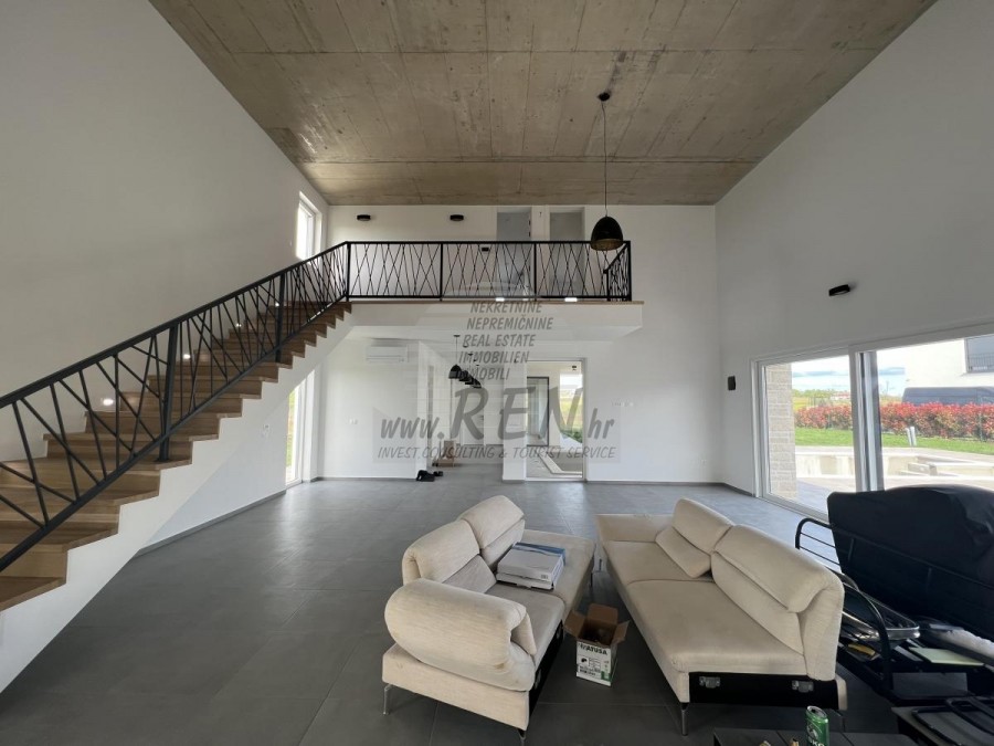 Vila ima 220 m2 te je podijeljena na prizemlje i kat. U prizemlju se nalazi ulazni hodnik, praona, kupatilo, spremište, spavaća soba, kuhinja s blagovaonicom te prostrani dnevni boravak s izlazom na bazen i vrt. Visina stropa u dnevnom boravku je 5 m. Na katu se nalaze 2 spavaće sobe, svaka sa svojim kupatilom te 2 terase od 22 m2 i 10 m2 s kojih se vidi more. Vila ima bazen od 48 m2 od kojih je 1/3 natkrivena. Bazen ima sistem protustrujnog plivanja, masazu i grijanje, tako da ima mogućnost korištenja tokom cijele godine. Vila se nalazi na velikoj parceli od 1220 m2 te ima natkriveni parking. U blizini se nalaze samo vile s bazenima i kuće za odmor. Vilu je moguće koristiti u stambene svrhe ili kao odličnu investiciju za turizam. Cijena se odnosi na gotovu kuću.