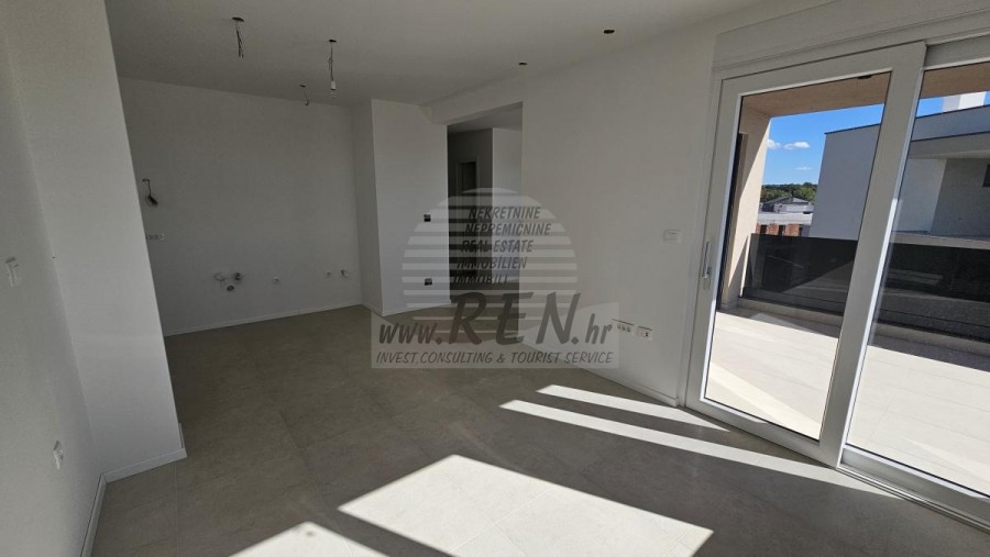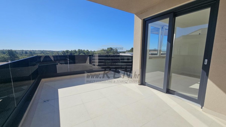 Stan u okolici Poreča sa divnim pogledom na more, ima ukupno 73,19 m2, nalazi se na trećem katu, faza gradnje, udaljen je 5 min. (1000m) od mora i od prekrasne uređene plaže, 5 min. (800m) udaljeni ste od centra. Stan se sastoji od kuhinje/dnevnog boravka/blagovaone, 2 sobe, kupaonice, ostave, terase i prostrane krovne terase. Opremljen je klima jedinicama, podnim grijanjem u kupatilima, te kaminom. Ima vlastito spremište i parking, te objekt sadrži i lift.