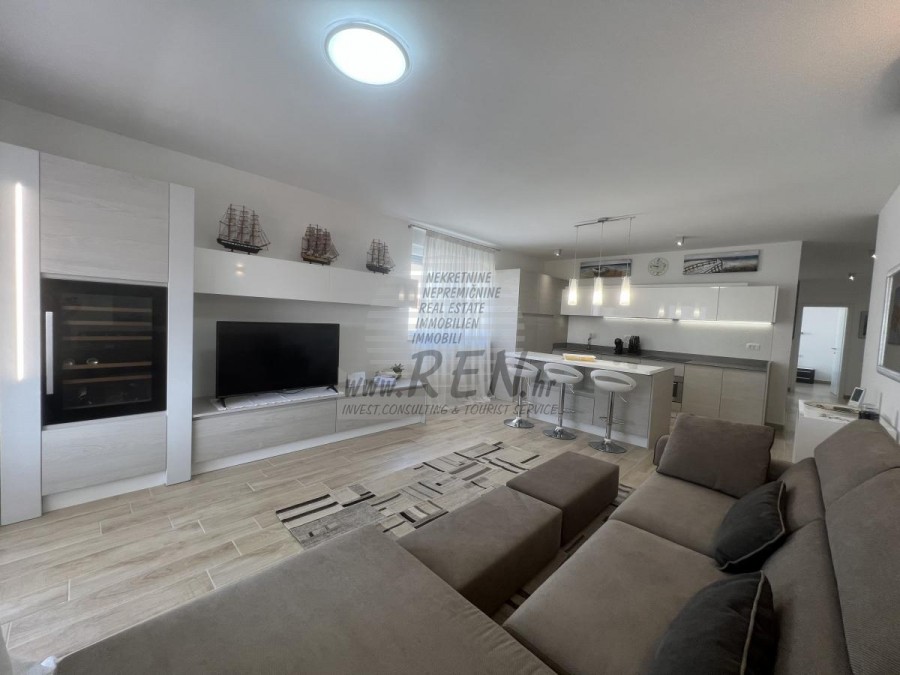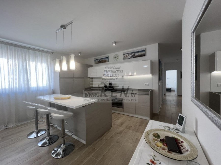 Stan u Novigradu sa predivnim pogledom na more ima ukupno 86,44 m2, nalazi se na prvom katu, udaljen je 5 min. (800m) od mora i od prekrasne uređene plaže, 10 min. (1000m) udaljeni ste od centra grada Novigrada. Stan se sastoji od hodnika, kuhinje/dnevnog boravka, 3 sobe, kupaonice i terase. Opremljen je klima uređajem, vlastitim parkingom, te spremištem.
