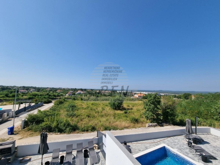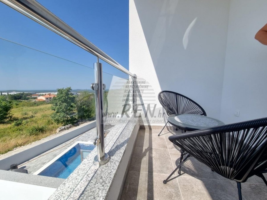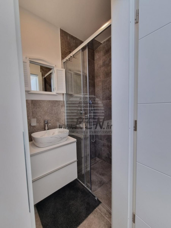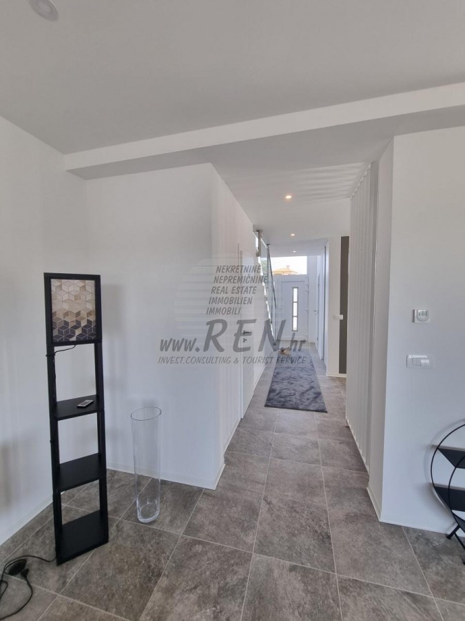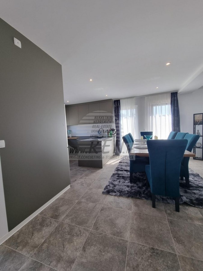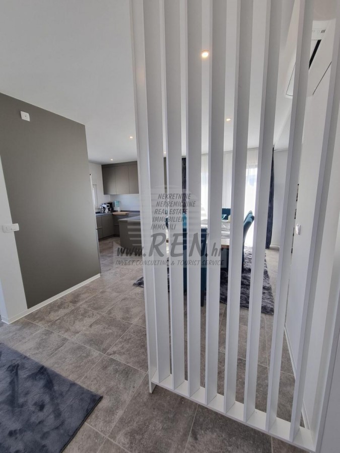 Na katu smještene su tri spavaće sobe i dva kupatila. Dvije spavaće sobe dijele zajednički balkon. Opremljen je klima uređajem, podnim grijanjem, vlastiti parking, te predivan pogled na more i okolnu prirodu!