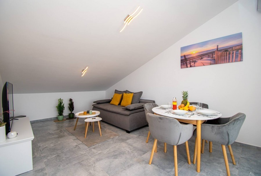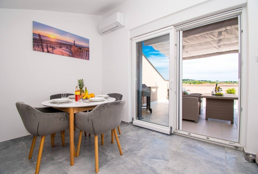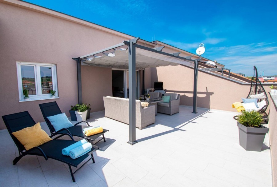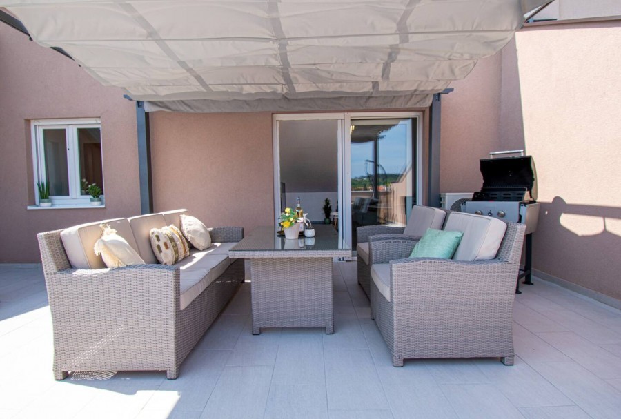 Terasa je opremljena sa ležaljkama, roštiljem i blagovaonicom pruža sve što je potrebno za opuštajući i ugodan odmor. S terase od 40 m2 pruža se pogled na more. Stan je opremljen PVC stolarijom, modernim pločicama, pergolom na terasi, klima uređajem.