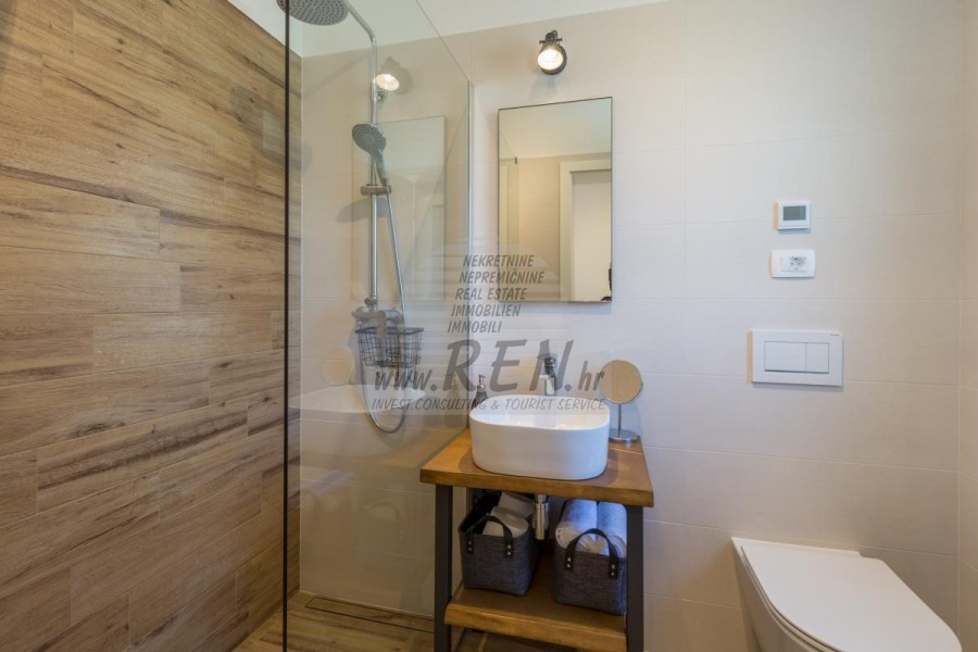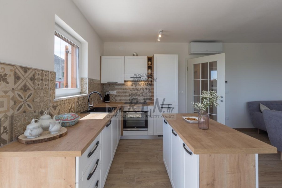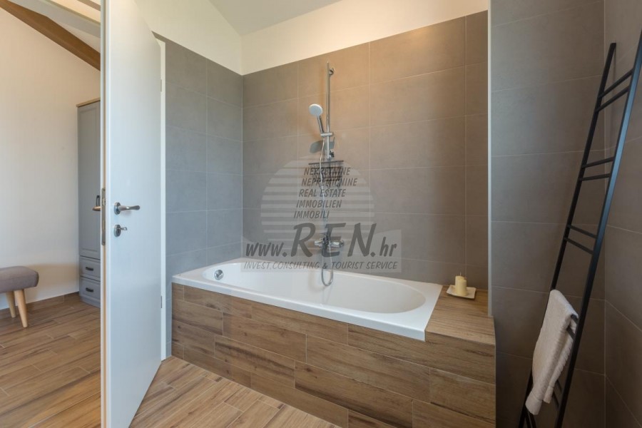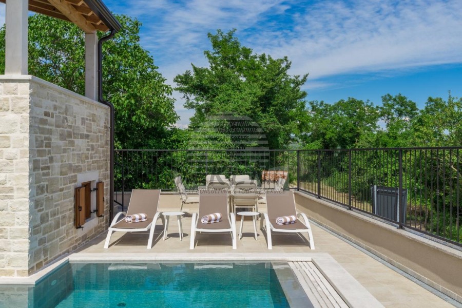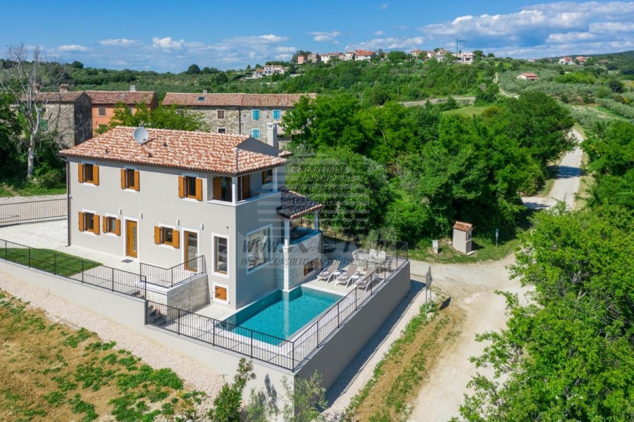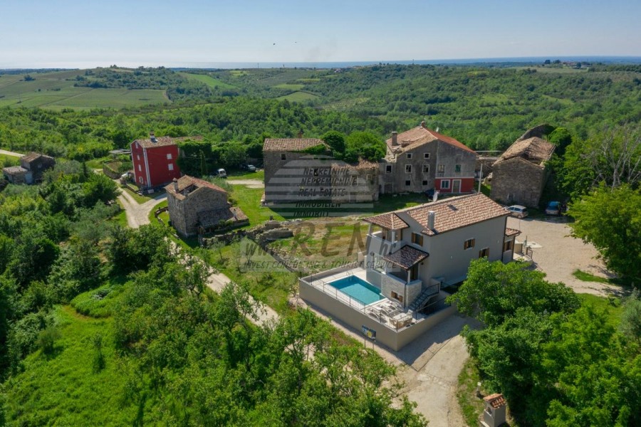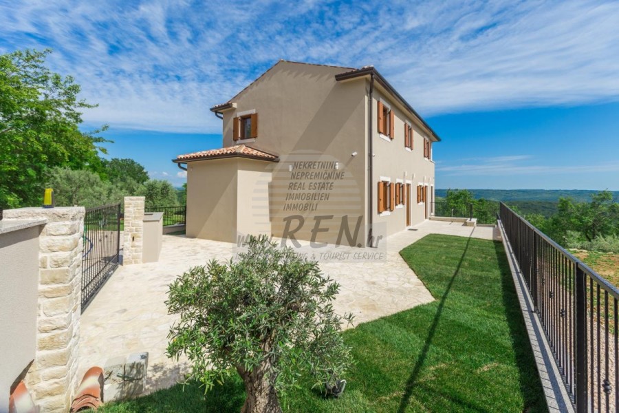 Prodaje se kuća s predivnim pogledom, sagrađena u istarskom stilu u okolici Buja. Stambena površina iznosi otprilike 150 m2 rasprostranjenih na 2 nadzemne i 1 podzemnu etažu. U podzemnoj etaži se nalazi kotlovnica sa spremištem, u prizemlju se nalazi gostinjski WC, veliki dnevni boravak s kuhinjom i blagovaonicom iz koje se pruža predivan pogled, izlaz na terasu, prostrana spavaća soba sa kupaonicom (walk-in tuš) i spremište koje može biti korišteno kao vešeraj, dok se na prvom katu nalazi hodnik/čitaonica, i 2 spavaće sobe, svaka sa svojom kupaonicom od koje jedna ima walk-in tuš, a druga kadu, i balkona s predivnim pogledom na prirodu i more. Okvirna površina okućnice iznosi 250 m2 na koju otpada bazen površine 30 m2, 2 parkirna mjesta, ljetna kuhinja i travnjak. Prilikom gradnje korišteni su kvalitetni materijali s puno kamenih detalja koji kući daju taj autohtoni štih, a sam objekt je kategoriziran na 4 zvjezdice (****). Grijanje je predviđeno podnim grijanjem koje se proseže na obje etaže, klima uređajima u svakoj sobi i dnevnom boravku, dok se u dnevnom nalazi i Palazzetti kamin na drva koji osim grijanja pruža i prekrasan ugođaj. Kuća ima jako dobru popunjenost u predsezoni, sezoni i postsezoni. Kuća se prodaje kompletno namještena.