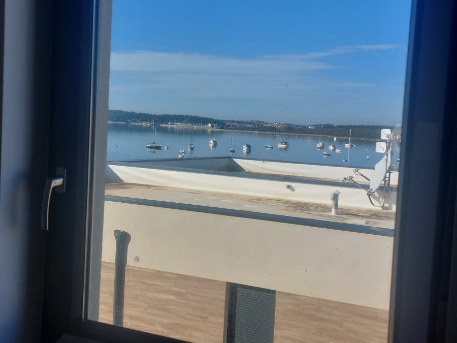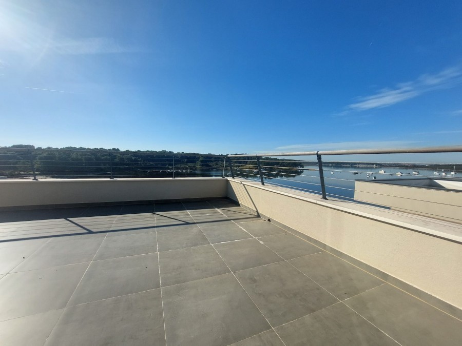 Na najatraktivnijoj lokaciji u Medulinu, s panoramskim pogledom na more, prodaje se jedinstven stan koji zauzima kompletnu treću etažu novoizgrađene manje zgrade.