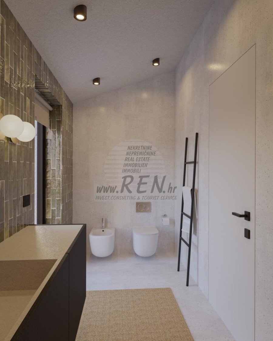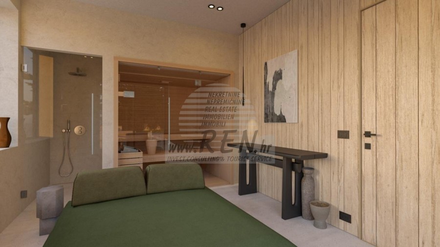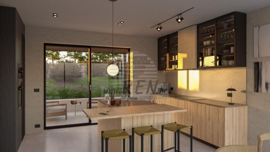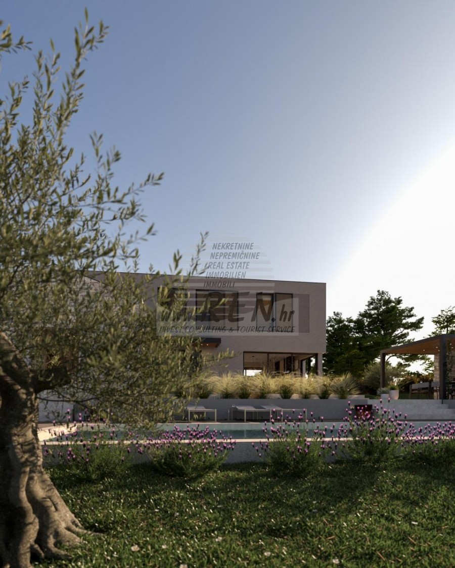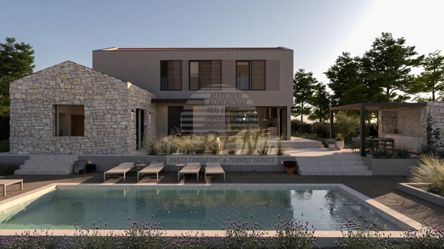 Smještena 15 km od centra Poreča te 10 km do najbližeg vrsarskog mora i njenih plaža, na brdašcu, u izgradnji je villa 180m2 unutarnjeg stambenog prostora na zemljištu od ukupno 938 m2. Parcela je lijepog pravilnog oblika i kao takva dozvoljava maksimalnu iskoristivost i za dodatne sadržaje na okućnici. Kuća se sastoji od dvije etaže - prizemlja, gdje se nalaze dnevni prostori u otvorenom konceptu, sanitarije, garderoba te tehničke prostorije za sistem centralnog grijanja i praona rublja sa svim potrebnim priključcima te prostorije za skladištenje osobnih stvari, bicikla te mobilne opreme za okućnicu i bazen. Posebni dio prizemlja očarava s neizostavnim wellnes prostorom sa saunom i tušem. Na katu su smještene 3 spavaće sobe sa zasebnim kupatilom. Na komotnoj ograđenoj okućnici bogatoj višestoljetnim stablima maslina, autohtonim cvijećem i travnjakom s navodnjavanjem nalazi se bazen sa sustavom za grijanje veličine 40 m2 sa sunčalištem te kamin s natkrivenim blagovaonskim prostorom gdje se smjestila i ljetna kuhinja. Naravno, naglasak moramo staviti na impozantnu metalnu kapiju koja uokviruju cijelu sliku unutar zidinama ograđenu nekretninu. Parking za dva vozila sa punjačem struje za električna vozila. Vrhunska kvaliteta gradnje sa fasadnom izolacijom 10 i 15 cm, pvc prozorima, aluminijskim kliznim griljama u sobama, klizne staklene stijene u prizemlju, podno grijanje na vodu sa dizalicom topline Mitsubishi, sustav hlađenja, vrata filomuro, podna obloga microtopping, talijanski namještaj i rasvjeta te vrhunska oprema u interijeru kao i u exterijeru glavne su značajke po kojima se investitor vodi pri konstrukciji cijele priče. Sve navedeno dočarava vam sliku jedne vrhunske ville koja zadovoljava sve parametre i najzahtjevnijih.