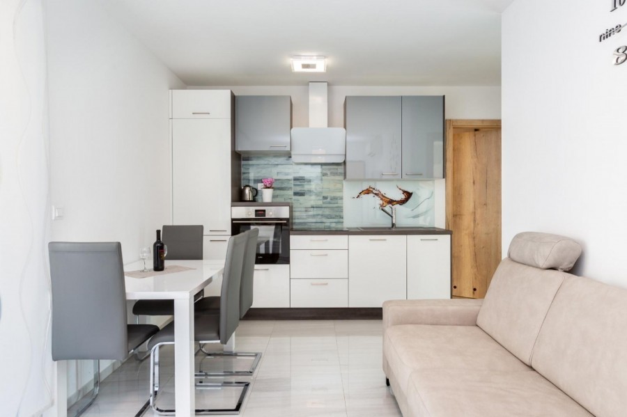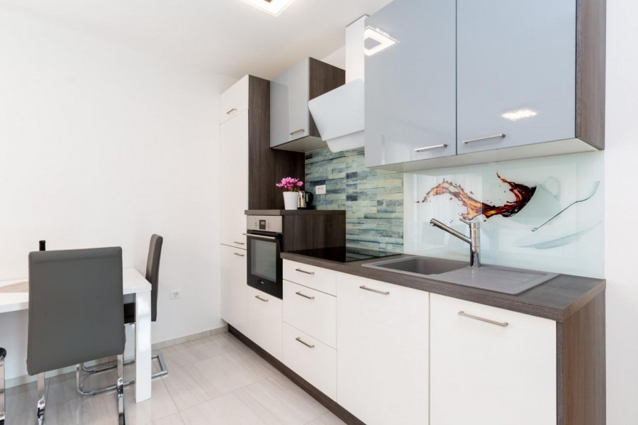 Stan se nalazi na 1 katu manje zgrade, i sastoji se od ulaznog hodnika, dnevnog boravka s kuhinjom, 2 spavaće sobe, 1 prostrane kupaone te balkona. Uz stan se prodaje i natkriveno parkirno mjesto od 13 m2.