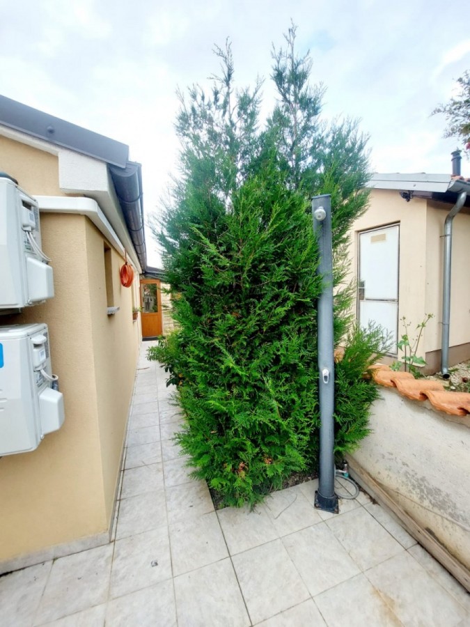 Na pomno uređenoj okućnici od 300 m2 su smješteni vanjski tuš, popločani dio zemljišta s natkrivenim parkingom za više automobila, te zeleni pojas oplemenjen mediteranskim raslinjem i vanjski tuš.