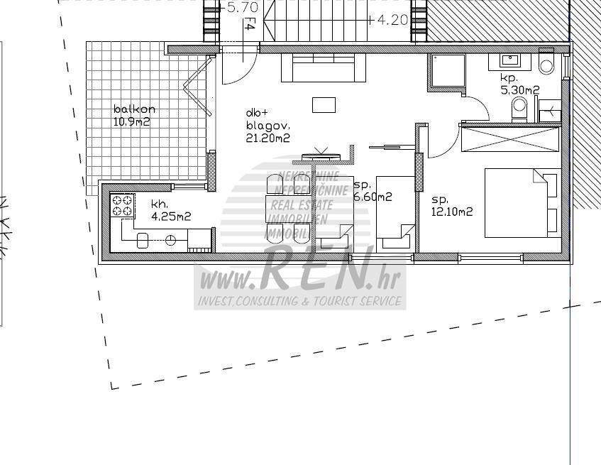 Stan F4 ima ukupno 49,45 m2, udaljena je 5 min. (400m) od mora i od prekrasne uređene prirodne plaže, 10 min. (6000m) udaljeni ste od centra Umaga. Stan se nalazi na drugom katu. U izgradnji. Ukupno ima 2 spavaće sobe, kuhinju, dnevnu sobu, kupatilo. Stan ima vlastiti parking, terasu, klima, spremište.