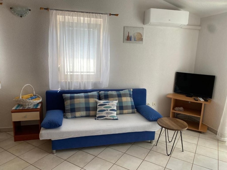 Čine ga dnevni boravak sa kuhinjom i blagovaonom , spavaća soba , manja soba , galerija , terasa sa pogledom na more , kupaona te 1 parkirno mjesto . Stanu pripada i zajednički prostor za roštiljanje u dvorištu zgrade.