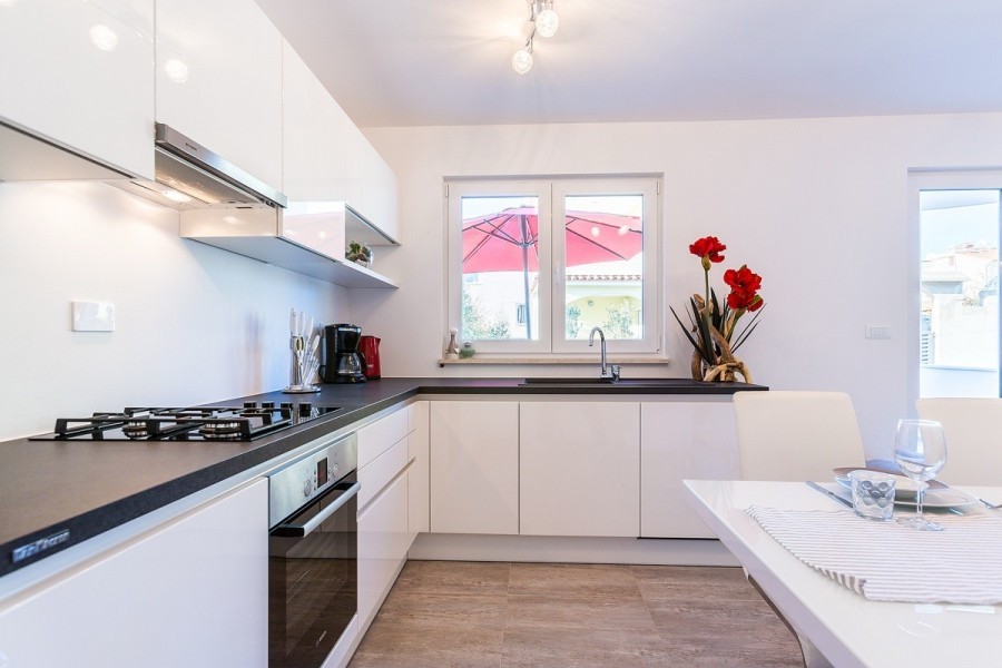 Na odličnoj lokaciji u Medulinu, svega 100 metara od plaže, prodaje se kvalitetno građena i luksuzno namještena kuća s dvije potpuno odvojene stambene jedinice – idealna za obiteljski odmor ili turistički najam.