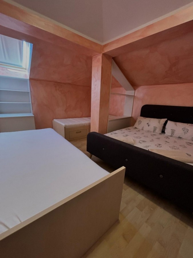 Druga etaža: drvene spiralne stepenice vode u potkrovlje, a sastoji se od : hodnika, spavaće sobe + dječje sobe i wc-a ( neto površine 26,64 m2 ).