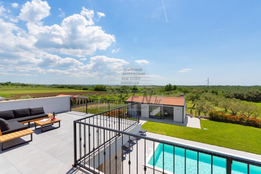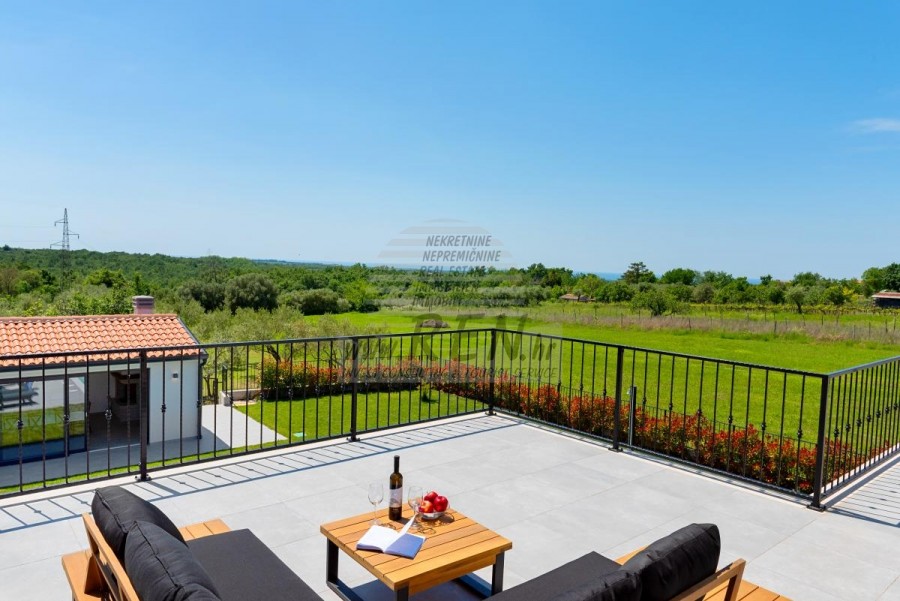 U srcu istarskog mira, u čarobnom mjestu Brtonigla, nalazi se ova raskošna vila koja kombinira moderni komfort s autentičnim mediteranskim štihom. Smještena na prostranom zemljištu od 3350 m², okružena maslinicima, vinogradima i voćkama, pruža potpunu privatnost i harmoniju s prirodom, dok se istovremeno nude spektakularni vidici na more.