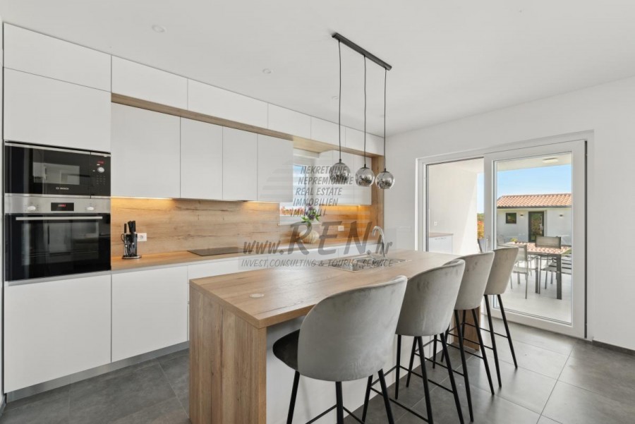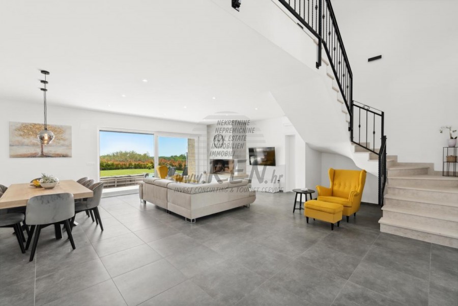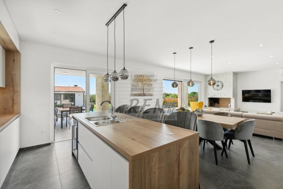 Glavna kuća, zajedno s pomoćnim objektom, čini ukupno 290 m² prostranog i pažljivo dizajniranog stambenog prostora. U prizemlju se nalazi jedna od tri spavaće sobe, idealna za goste ili starije članove obitelji, dok su preostale dvje smještene na katu, sve opremljene vlastitim kupatilom za maksimalnu udobnost. Dnevni boravak, prostran i pun svjetla, centar je kuće – s toplim kaminom, modernom otvorenom kuhinjom i direktnim pristupom velikoj terasi s kojeg se pruža nezaboravan pogled na more. Klimatizacija i podno grijanje osiguravaju savršenu temperaturu tijekom cijele godine. Osim glavne kuhinje u dnevnom boravku, vila nudi još tri dodatne kuhinje koje čine ovaj prostor idealnim za ugostiteljske potrebe ili velike obiteljske okupljanja. Jedna se nalazi u pomoćnom objektu zajedno s blagovaonicom, druga je smještena na natkrivenoj terasi u prizemlju, dok treća kuhinja čeka u samom dvorištu, omogućavajući lagano pripremanje roštilja i društvenih fešta na otvorenom.