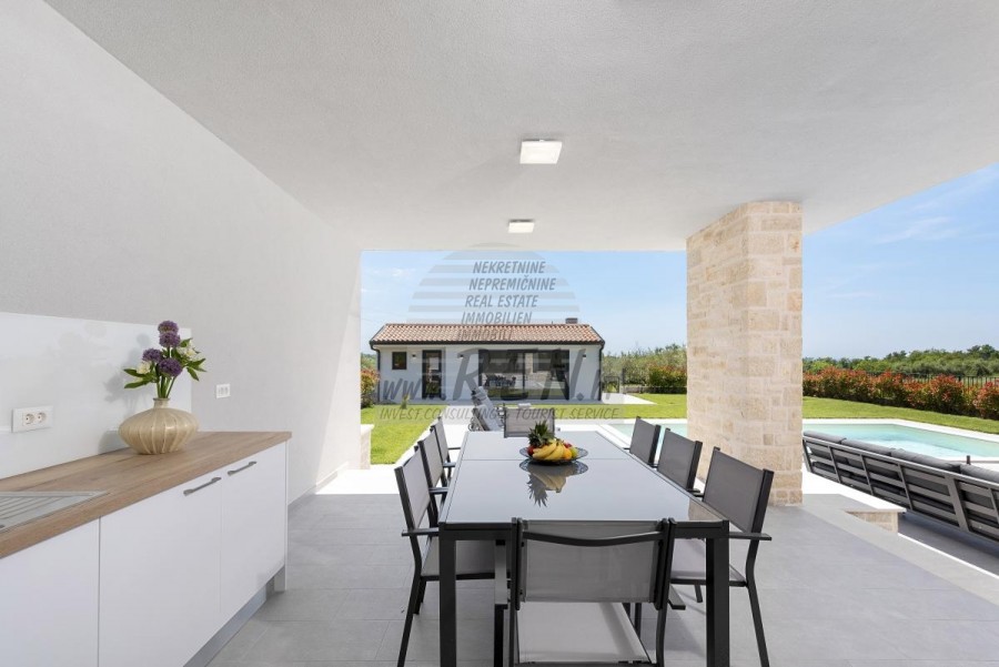 Vanjska sredina vile je pravi oaza za opuštanje. Bazen s elektrolizom osigurava čistoću vode bez iritantnih kemikalija, dok okolni sunčani terasi i zelenilo pozivaju na dugotrajno kupanje i uživanje u toplim danima. Za najmlađe je osigurano dječje igralište, dok će ljubitelji prirode cijeniti voćnjak i masline koje krasaju imanje.