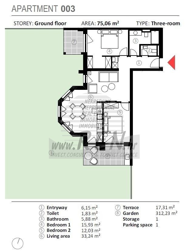 Stan 003 u Umagu ima ukupno 92,37 m2 + vrt, nalazi se u prizemlju, udaljen je 5 min. (600m) od mora i od prekrasne uređene plaže, 5 min. (400m) udaljeni ste od centra grada Umaga. Stan se sastoji od kuhinje/dnevnog boravka/blagovaone, 2 sobe, kupaonice, WC, terasa. Opremljen je klima uređajem, lift, vlastiti parking, spremište.