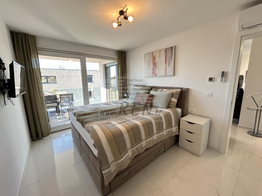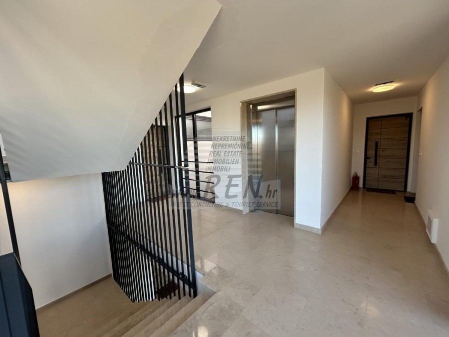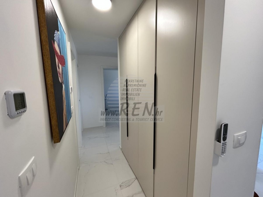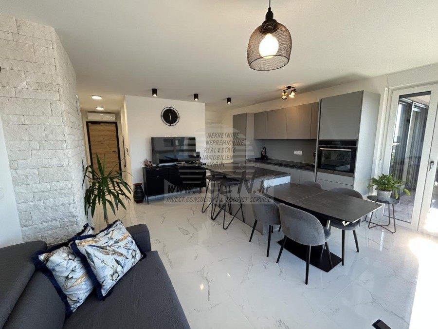 Prilika za kupnju stana u kvalitetnoj novogradnji s liftom u Novigradu. Ono što je posebno ističe je da je cijela zgrada napravljena od betona te je opremljena aluminijskom stolarijom i 3-slojnim staklom što je čini izuzetno kvalitetnom. Stan se nalazi na 2. katu te ima 72 m2 + krovna terasa od 60 m2. Stan se sastoji od ulaznog hodnika, kupatila, 2 spavaće sobe i open space prostora u kojoj se nalazi kuhinja s blagovaonicom i dnevni boravak s izlazom na natkrivenu terasu sa koje se pruža lijep pogled na more. Svaka prostorija u stanu opremljena je klima uređajem i podnim grijanjem, a stan također ima i dimnjak te postoji mogućnost ugradnje kamina ili peći na pelete. Stanu pripada velika krovna terasa s koje se pruža panoramski pogled na more, te se na njoj nalazi ljetna kuhinja i priključci za tuš i jacuzzi. Stanu pripada 1 natkriveno parkirno mjesto te zajedničko spremište za bicikle koje se nalazi ispred zgrade. Stan je opremljen kvalitetnim namještajem te se prodaje kompletno opremljen.