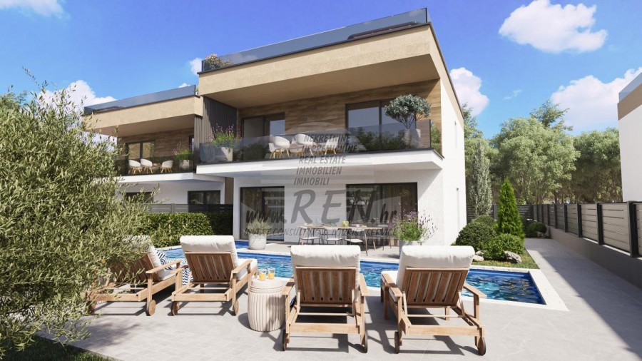 Kuća ima 170 m² raspoređenih na 2 etaže + 70 m² krovne terase s panoramskim pogledom. U prizemlju se nalazi otvoreni dnevni boravak s kuhinjom, blagovaonicom, wc-om te terasom od 18 m² koja vodi prema bazenu. Na katu su 3 spavaće sobe s vlastitim kupaonicama i terasom.
