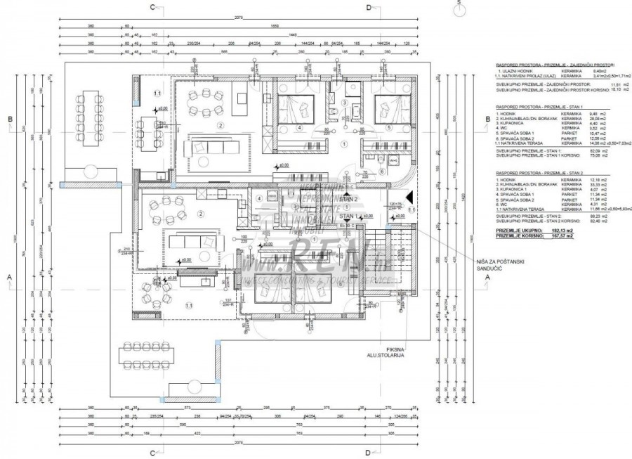 Stan će biti opremljen vrhunskom talijanskom keramikom, dok su u spavaćim sobama predviđeni parketi. U svim prostorijama predviđena je priprema za klima uređaje, kao i instalacija za ljetnu kuhinju. Dodatnu udobnost pruža podno grijanje u svim prostorijama s individualnom regulacijom temperature.